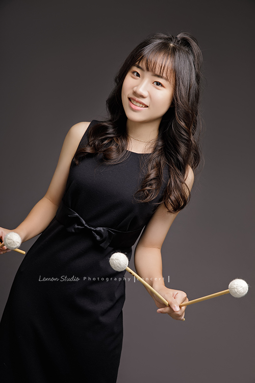 就讀高中的亞璇,學習的樂器是馬林巴木琴,和之前來拍照的珈瑄是好朋友!這天亞璇穿著黑色洋裝入鏡,拍起來非常有氣質很美啊!這張亞璇一手拿琴棒,一手放後面,帶著微笑看鏡頭,很有氣質且親切的一張相片