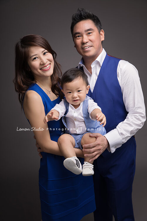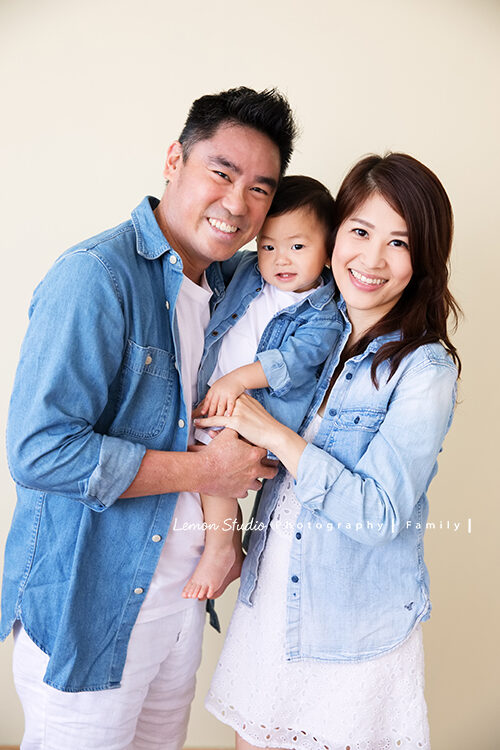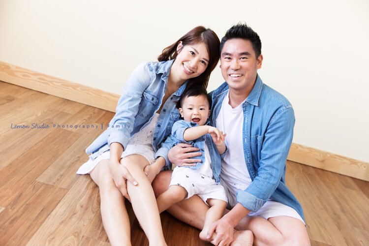九個月大的廷恩一家來檸檬巷館拍全家福,一家人換上較正式的藍色系服裝,優雅的媽麻抱著廷恩開心的合照!