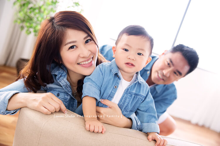 九個月大的廷恩一家來檸檬巷館拍全家福,一家人換上較正式的藍色系服裝,優雅的媽麻抱著廷恩開心的合照!