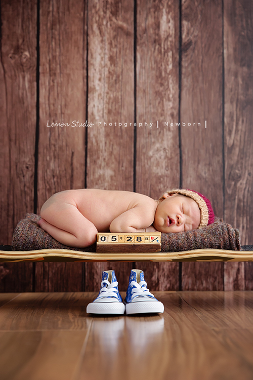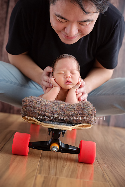 男寶寶乙緁出生13天大時的系列相片,這張相片很特別寶寶在爸拔的滑板上拍照,因為滑板是爸爸的興趣!