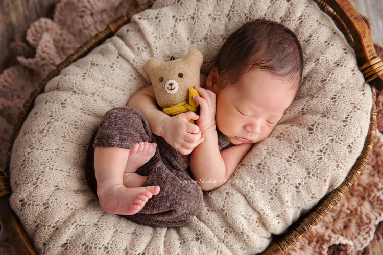 男寶寶乙緁出生13天大時的系列相片,這張寶寶抱著小熊躺在籐籃裡,寶寶的頭髮好順啊!