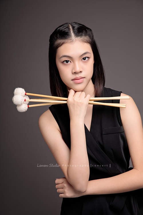 珈瑄學的樂器是馬林巴木琴,這天帶著琴棒來拍照!這張是珈瑄手拿琴棒看著鏡頭微笑的相片,珈瑄帶著自信沈穩的氣質!