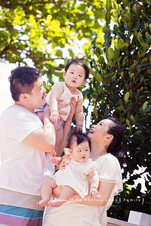 一家人坐在沙灘上的椅子上的全家福!哥哥表情超可愛!